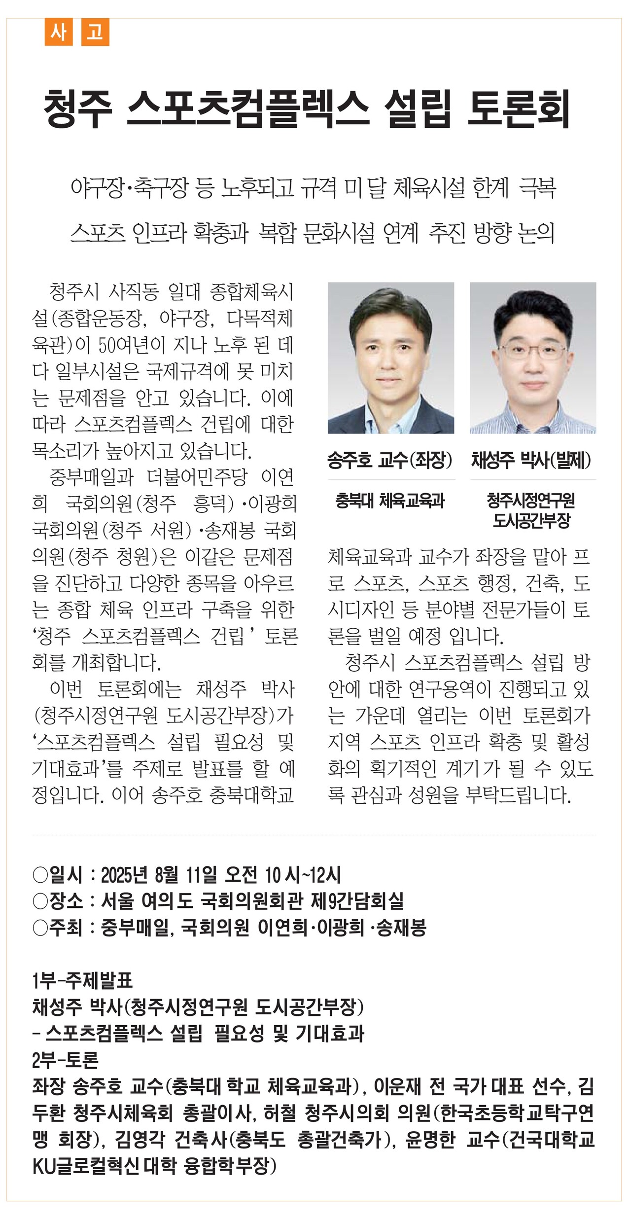 중부매일과 더불어민주당 이연희 국회의원(청주 흥덕)·이광희 국회의원(청주 서원)·송재봉 국회의원(청주 청원)은 이같은 문제점을 진단하고 다양한 종목을 아우르는 종합 체육 인프라 구축을 위한 '청주 스포츠컴플렉스 건립' 토론회를 개최합니다.