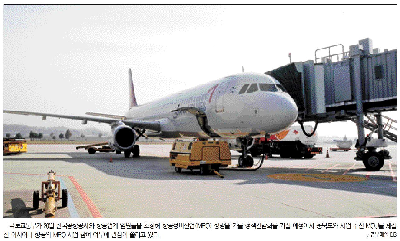 [중부매일 한인섭 기자] 국토교통부가 20일 한국공항공사와 항공업계 임원들을 초청해 항공정비산업(MRO) 향방을 가를 정책간담회를 가질 예정이서 충북도와 사업 추진 MOU를 체결한 아시아나 항공의 MRO 사업 참여 여부에 관심이 쏠리고 있다. 충북도는 국토부의 국비 지원과 사업계획서 평가 방향 등이 제시되면 검토를 거듭하고 있는 아시아나 항공이 긍정적 판단을 하는 계기가 될 것이라는 기대감을 보이고 있다.
