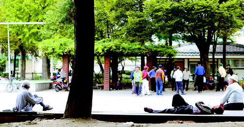 주로 혼자 나온 이들은 나무 그늘 아래에 앉아 휴식을 취하거나 윷놀이, 장기 등 그들만의 놀이를 하고 있다.